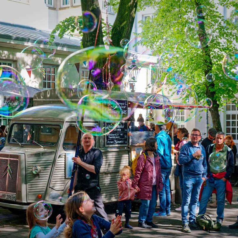 Voor buitenlocaties is een mobiele walk-act met zeepbellen in Gent een sterke keuze. Deze formule beweegt zich tussen het publiek en zorgt voor spontane reacties, foto’s en verwondering.